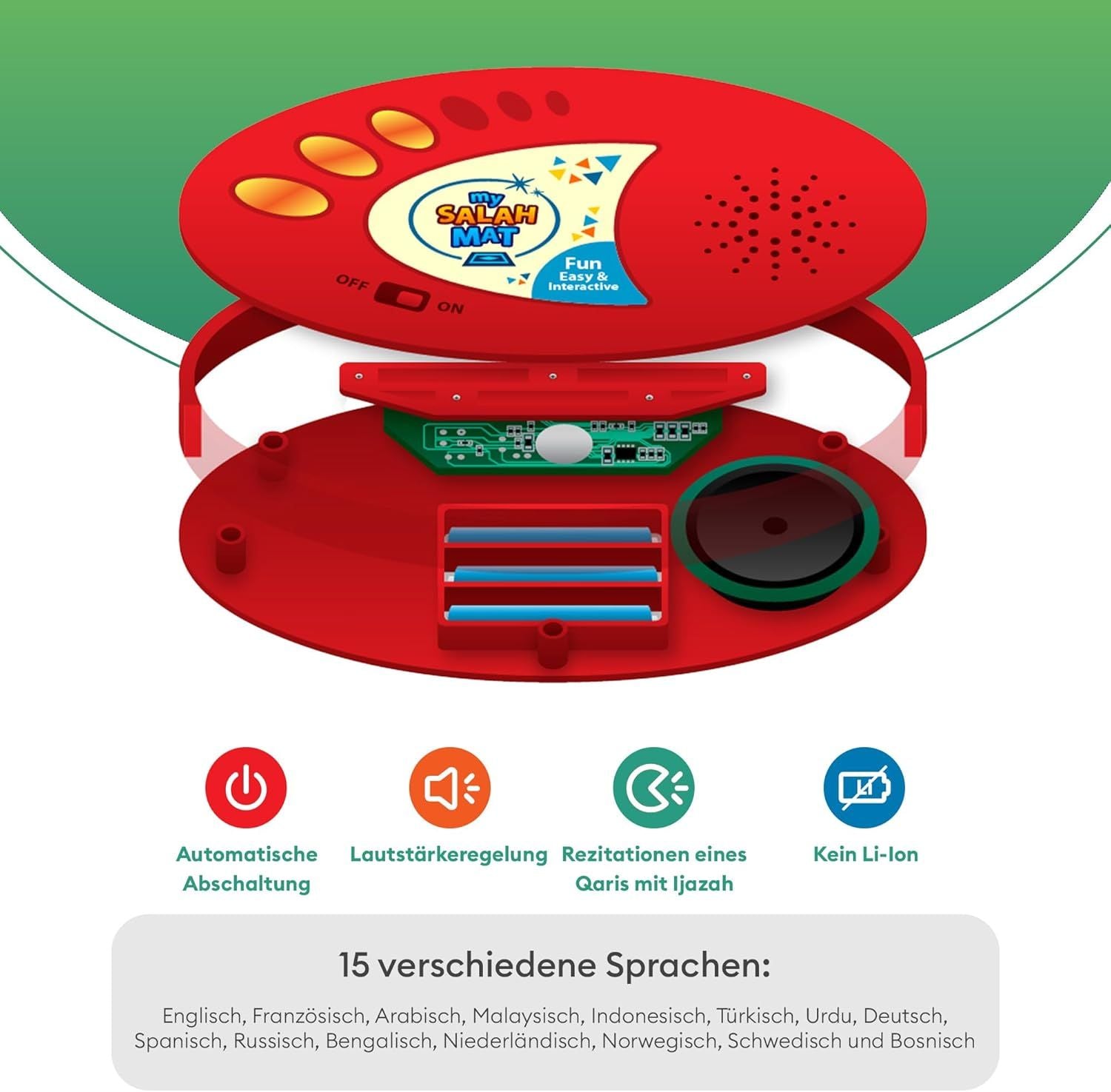Interactive Learning – Touch sensors respond to prayer positions (feet, knees, hands, and forehead), reciting the correct words including Allahu Akbar and Surah Al-Fatiha.
